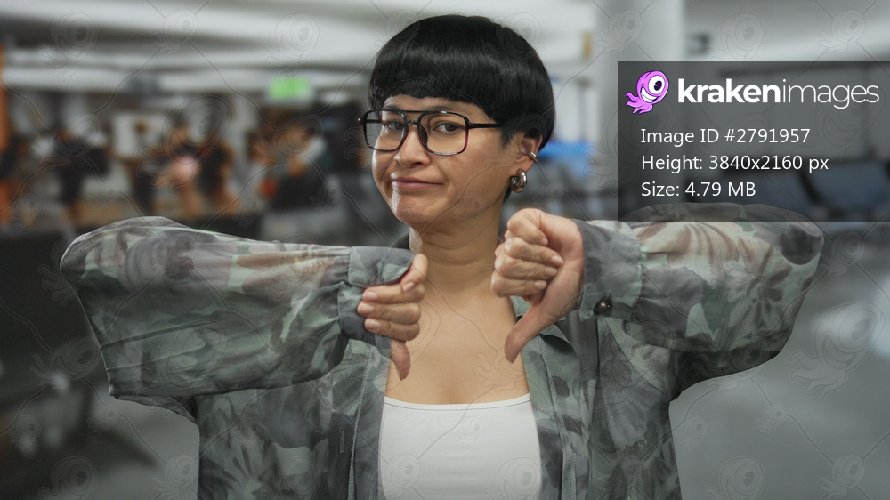 Woman showing disapproval indoors at airport with a thumbs-down gesture while waiting amid empty seats, wearing glasses and patterned shirt in a modern terminal environment. - Kraken Images