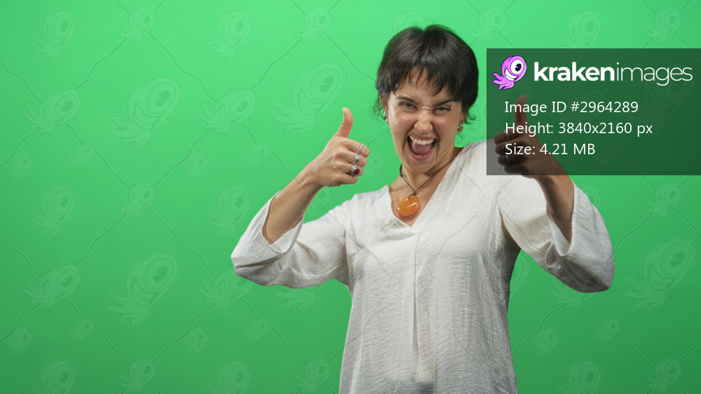 Woman showing double thumbs up with rings and amber pendant necklace, energetic grin in green studio; approval joy.