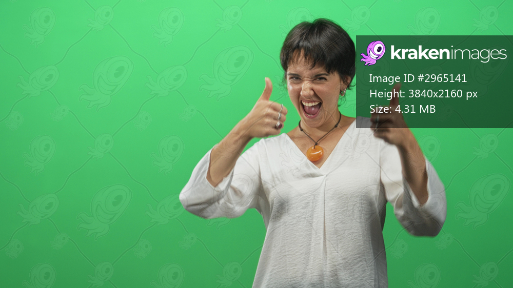 Woman showing double thumbs up with rings and amber pendant necklace, energetic grin in green studio; approval joy.