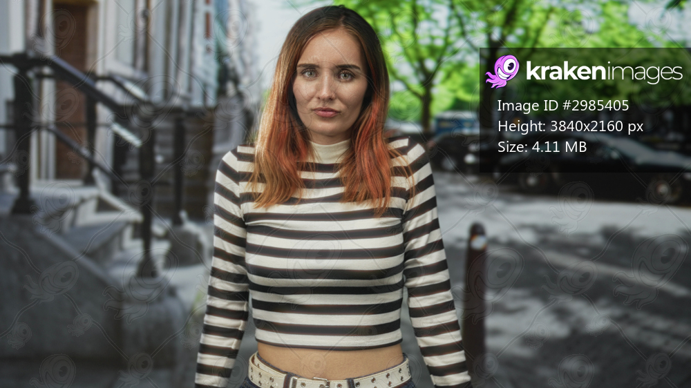 Woman showing exposed stomach smiles with head tilt in striped crop top on a city street; friendly casual confidence.