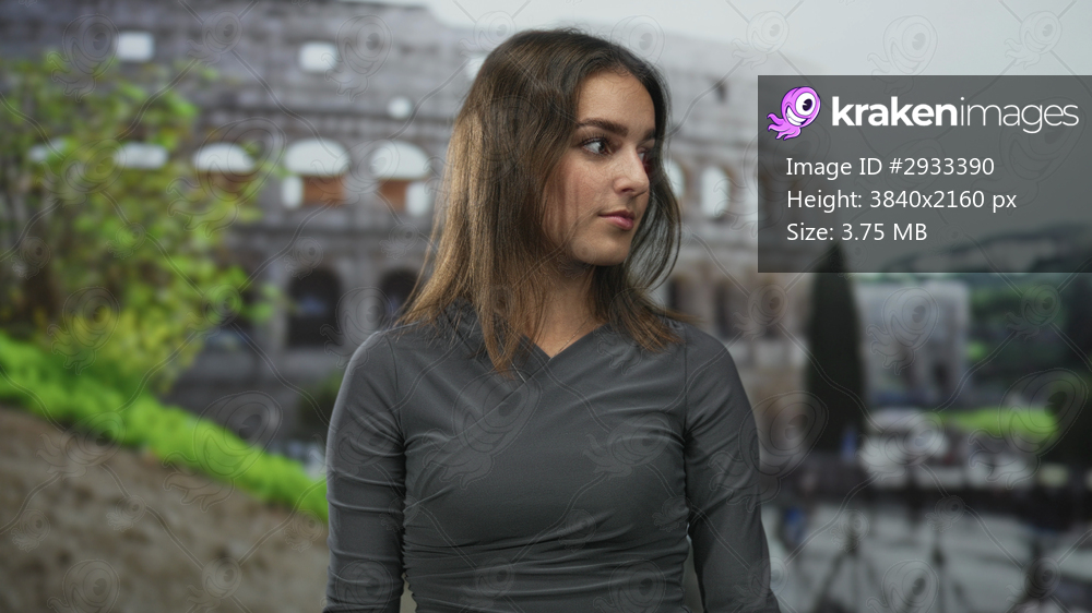 Woman showing face looking to the side toward the coliseum building in rome outdoors tourist site; contemplation.
