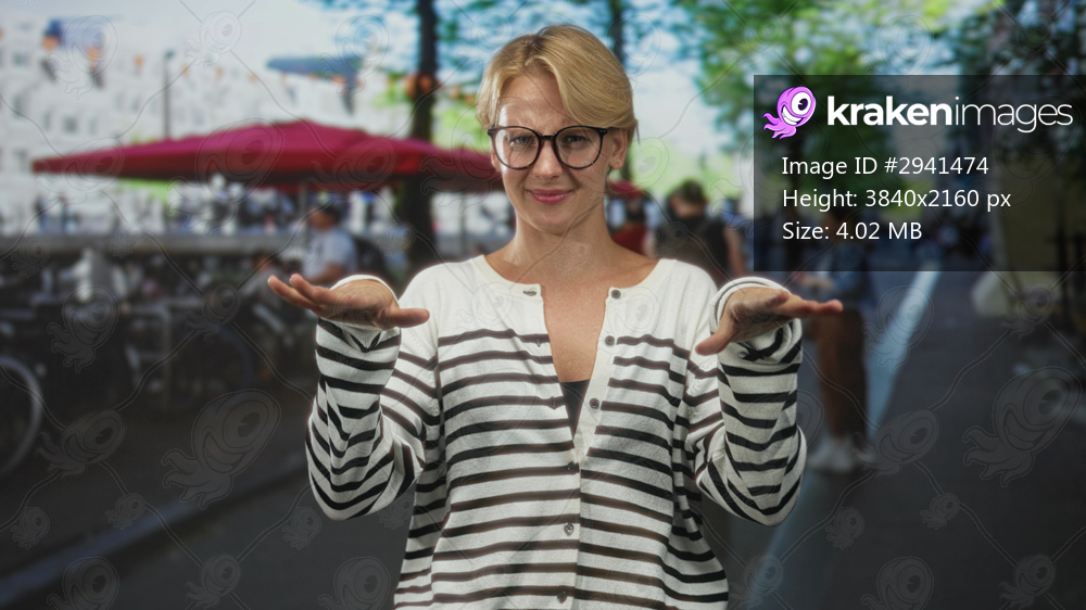 Woman showing hands in small measuring and palms up gestures beside a street cafe with red umbrella and bicycles; uncertainty questioning.