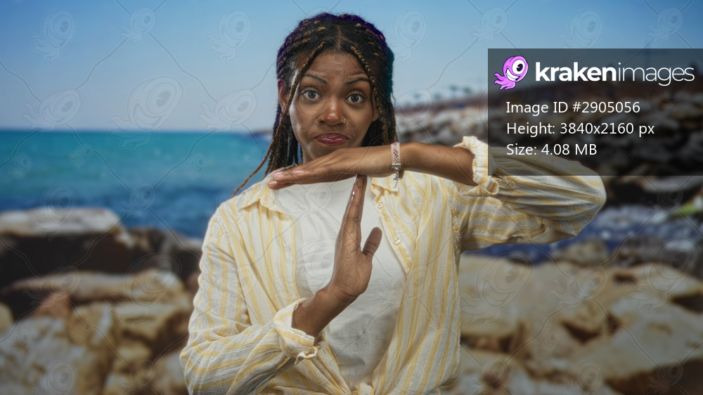 Woman showing hands in timeout gesture and surprised expression in a studio beach backdrop; surprise caution.