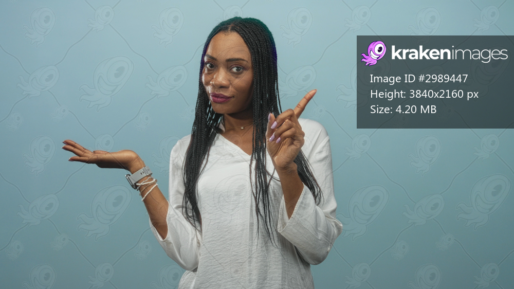 Woman showing left palm up and pointing right index finger while wearing white blouse in studio; confidence instruction clarity.