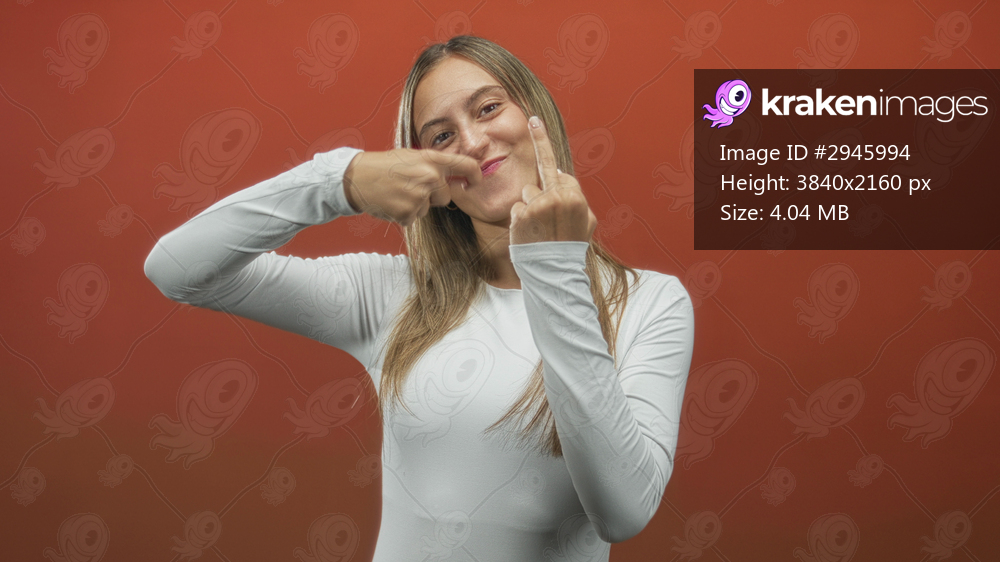 Woman showing middle finger gesture and clenched fist in studio with orange backdrop; defiance attitude.