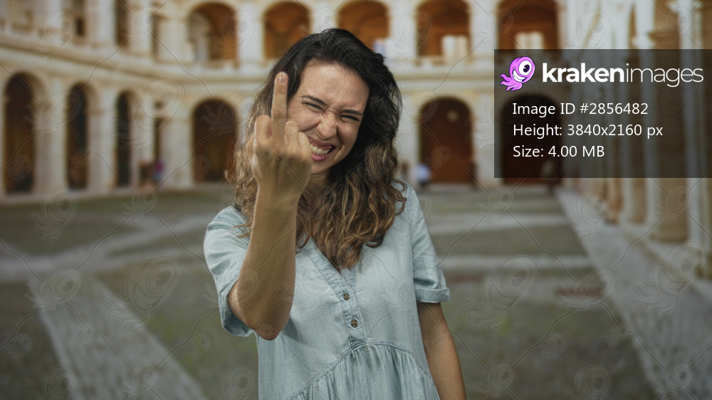 Woman showing middle finger in a sunlit building courtyard with arched corridors and worn stone floors; defiance.