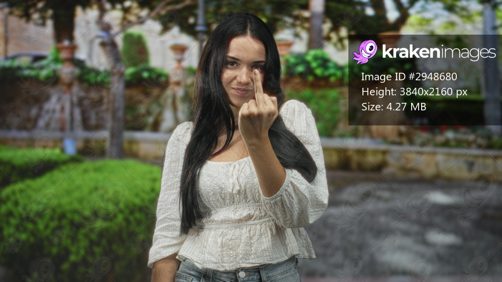Woman showing middle finger and pointing with other hand in a courtyard building setting, smirking at camera; defiance.