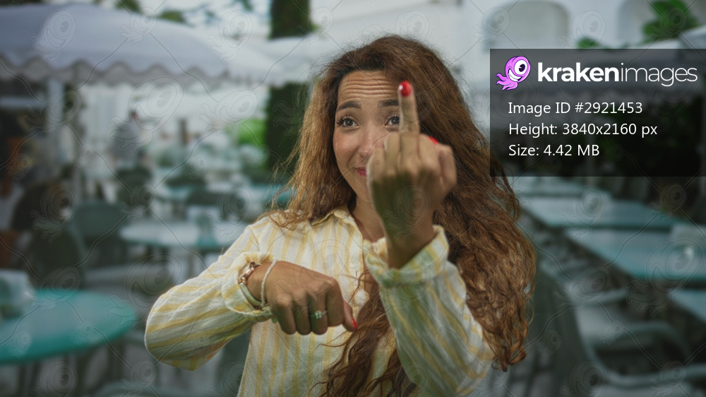 Woman showing middle finger with red nail at restaurant terrace outdoors, smiling and pointing hand toward camera; defiance.