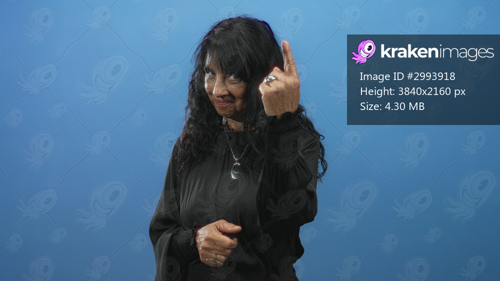 Woman showing middle finger with rings and crescent pendant, wearing black top against a blue studio backdrop, smirking at camera; defiance.