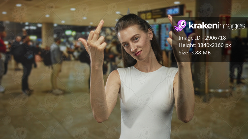 Woman showing middle fingers toward camera in a busy airport terminal wearing a white sleeveless top; defiance bold attitude.