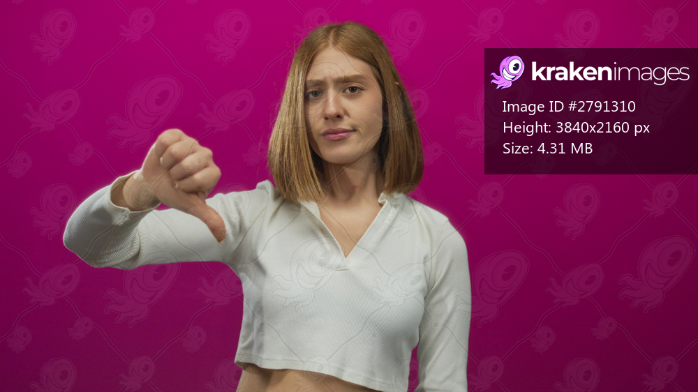 Woman showing negative gesture with thumb down against vibrant pink background, expressing dissatisfaction while isolated for dramatic effect in a colorful setting. - Kraken Images