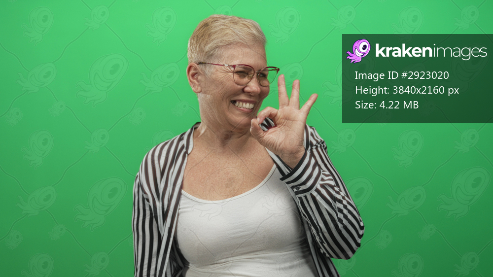 Woman showing ok hand gesture and smiling in a green studio wearing glasses and a striped shirt; cheerful confidence approval.