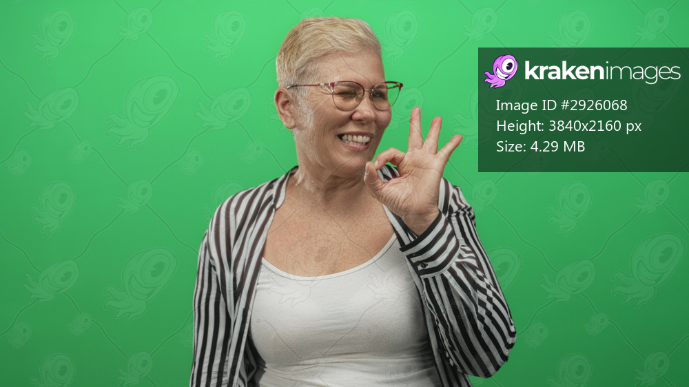 Woman showing ok hand gesture and smiling in a green studio wearing glasses and a striped shirt; cheerful confidence approval.