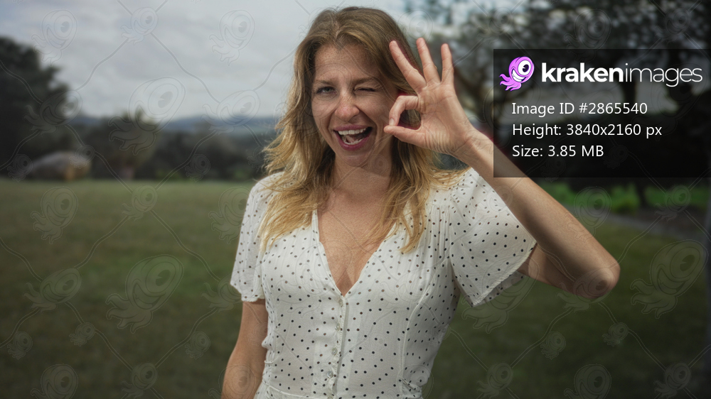 Woman showing ok hand gesture and visible cleavage in forest meadow, smiling and winking; playful confidence.