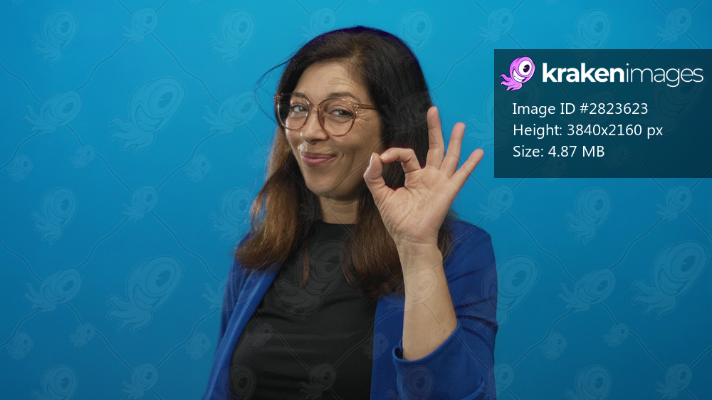 Woman showing ok hand sign and raising index finger in studio on vivid blue wall with friendly smile; approval.