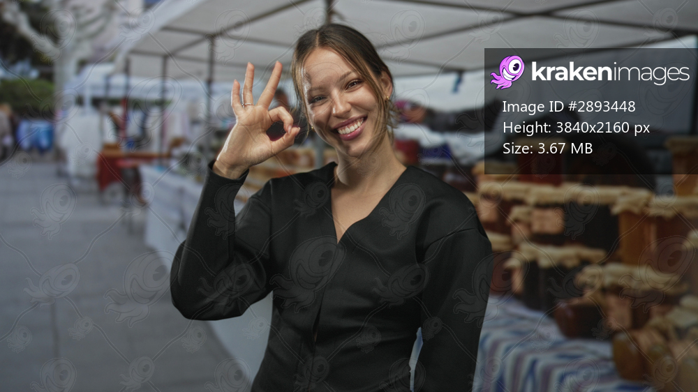 Woman showing ok sign with both hands at street market stall selling souvenirs and jars, smiling with closed eyes; joy friendliness warmth.