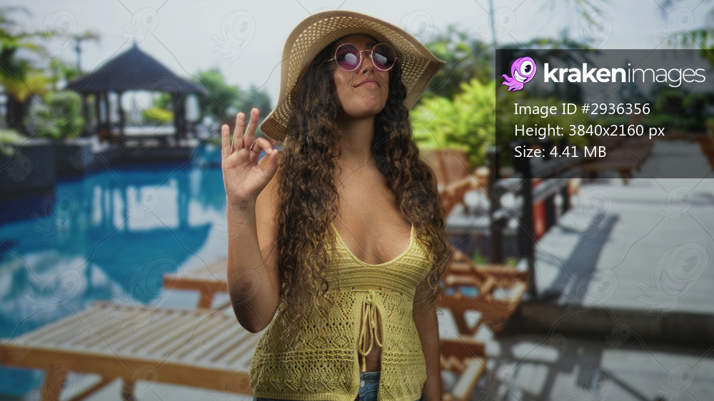 Woman showing ok sign with hand at poolside building wearing sunhat and sunglasses; relaxed holiday leisure.
