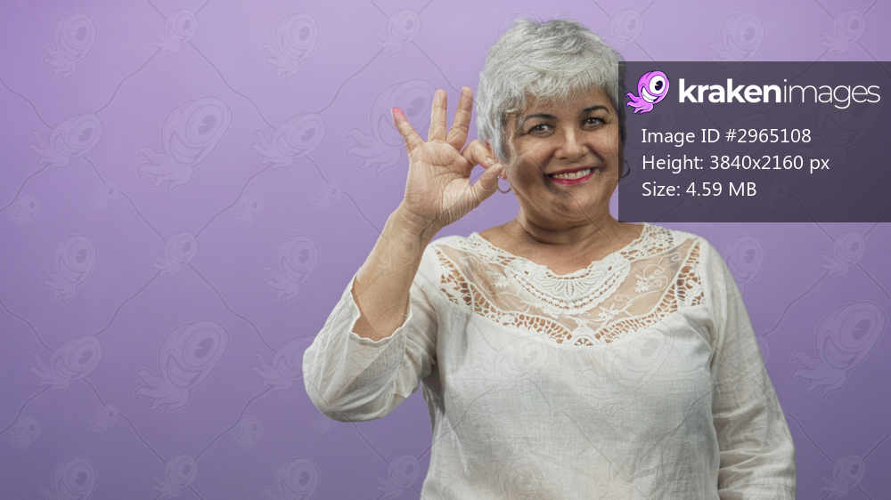 Woman showing ok sign with her right hand while smiling in a studio, wearing a white lace blouse and hoop earrings; approval confidence.