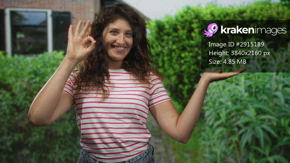 Woman showing ok sign with left hand and open right palm presenting at house entrance in striped shirt, smiling with freckled face; friendly welcome happiness. - Kraken Images