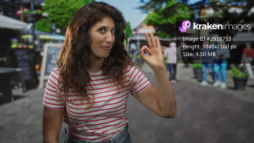 Woman showing ok sign with right hand on busy city street market, smiling and offering approval; cheerful confidence.