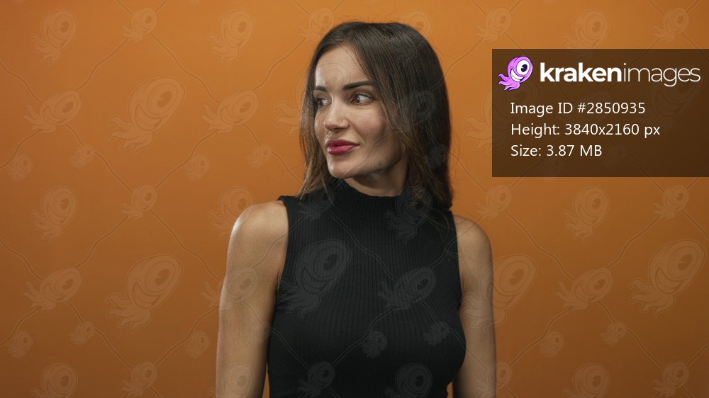 Woman showing open mouth and bare shoulder while looking sideways with head turned in an orange studio backdrop; surprise.