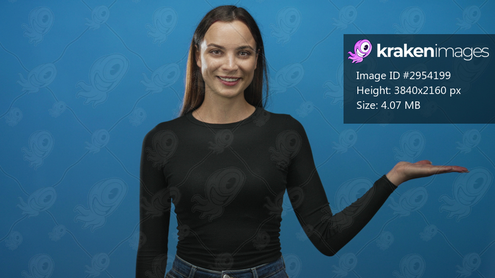 Woman showing open palm and raised hand in blue studio wearing black long sleeve shirt and jeans; confidence invitation welcome.