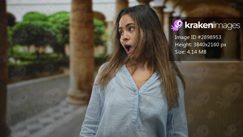 Woman showing open palms gesture and surprised mouth in a historic building colonnade; surprise curiosity wonder.