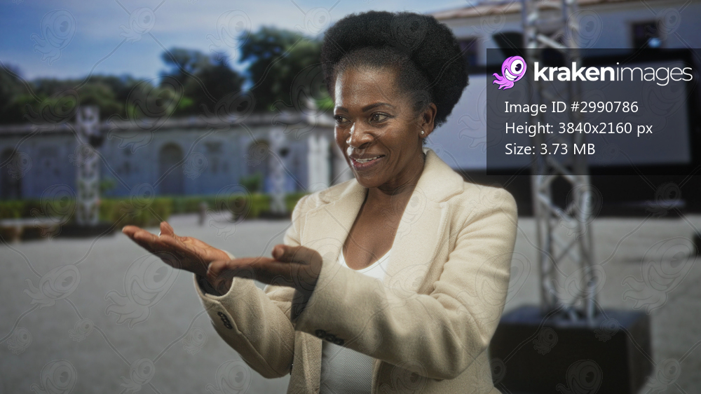 Woman showing open palms in a presenting gesture in front of a building event screen and truss at an outdoor courtyard stage; welcome joy.