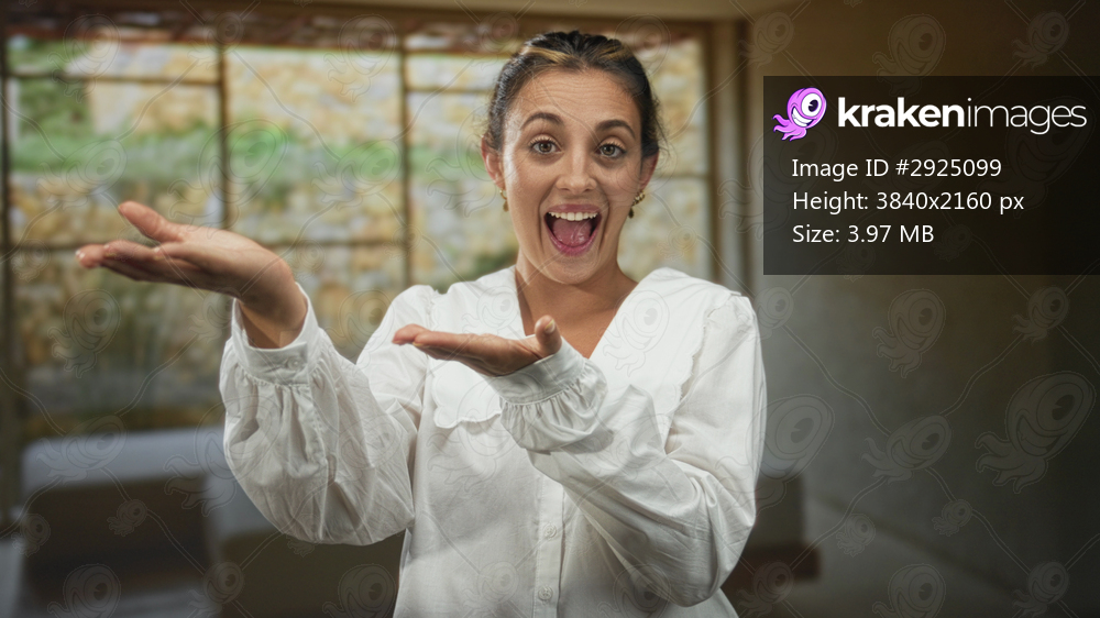 Woman showing open palms and smiling in studio, white blouse with visible hands and expressive face; friendly surprise.