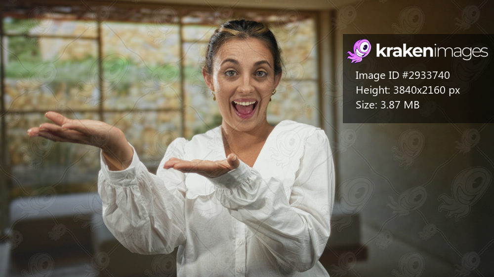 Woman showing open palms and smiling in studio, white blouse with visible hands and expressive face; friendly surprise.