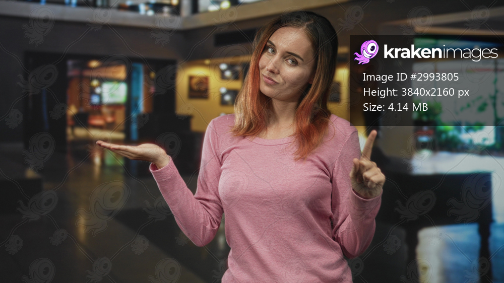 Woman showing outstretched palm and raised index finger in a building lobby wearing pink sweater and casual pose; quiet doubt.