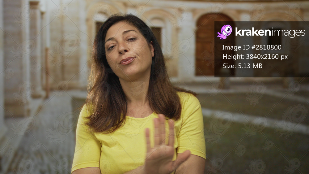 Woman showing palm forward gesture with raised hand in old town street near stone building facade; refusal rejection.