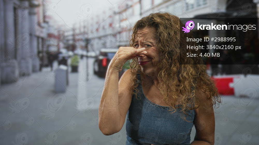 Woman showing palm raised in a stop gesture on a busy city street, wearing a denim tank top and frowning with furrowed brow; annoyance refusal.