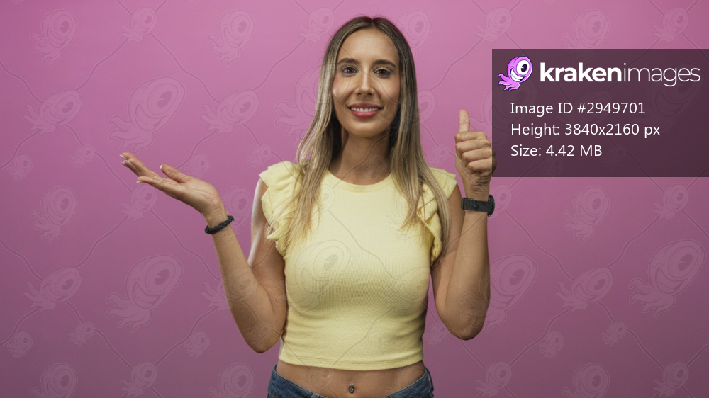 Woman showing palm up and pointing finger in a pink studio wearing a yellow top; product demo playful.