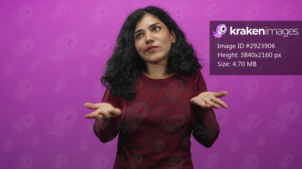 Woman showing palms out with hands forward and steady posture in studio against vibrant magenta purple backdrop; playful.