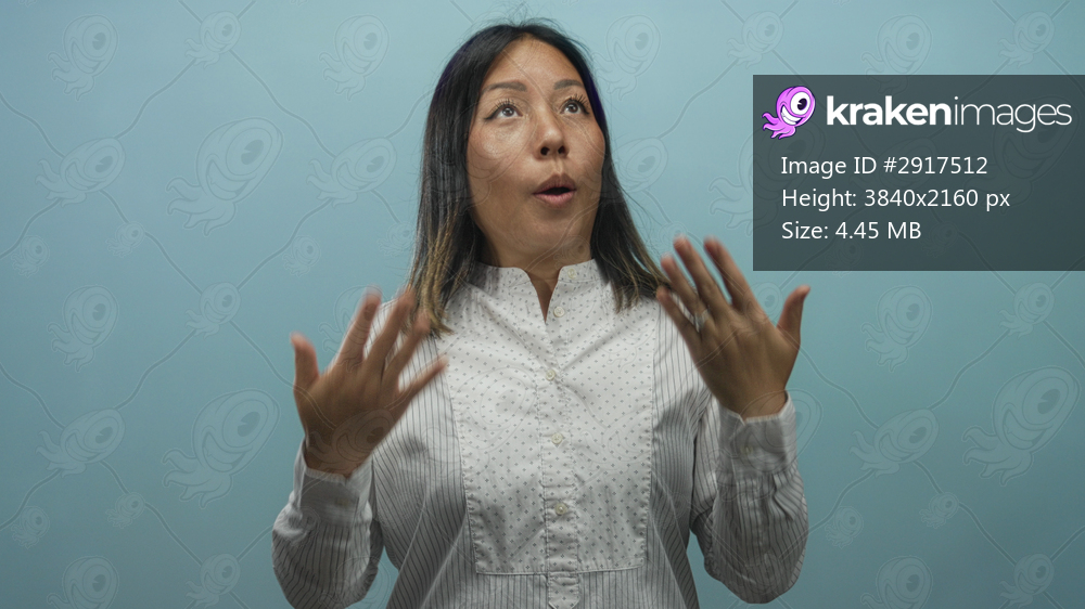 Woman showing palms and touching hair while gesturing with both hands in a studio against a light blue backdrop; calm.