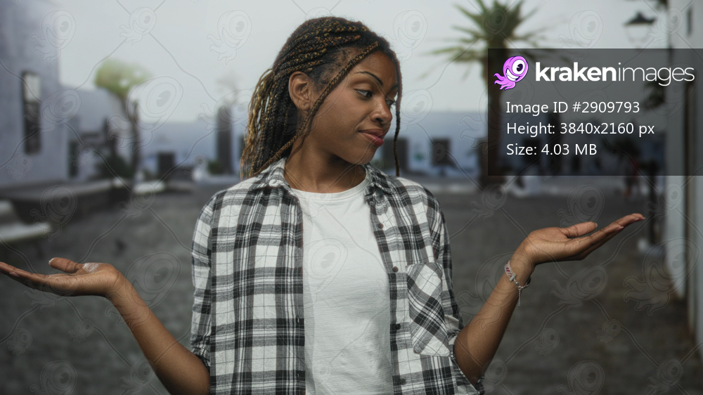 Woman showing palms up gesture with both hands on a cobblestone street wearing white tee and plaid shirt; contemplation.