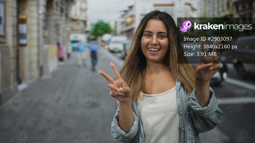 Woman showing peace sign with both hands, smiling at camera on a city street with parked cars and blurred pedestrians; joy carefree.