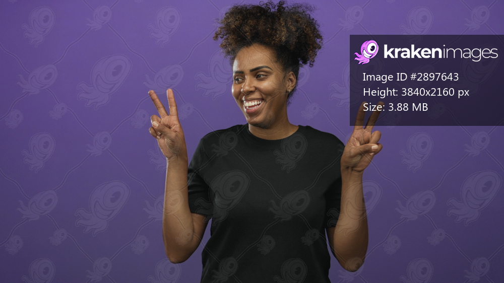 Woman showing peace sign with both hands, smiling and looking aside in purple studio with curly hair; joy.