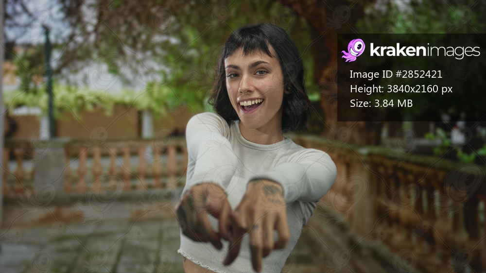 Woman showing peace sign with fingers at eye beside stone building facade during daylight; playful energy.