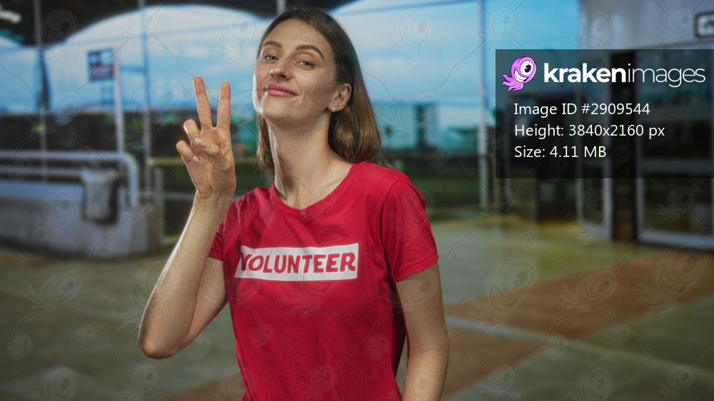 Woman showing peace sign with hand at airport terminal outdoors wearing red volunteer tshirt and smiling with closed eyes; optimism solidarity.