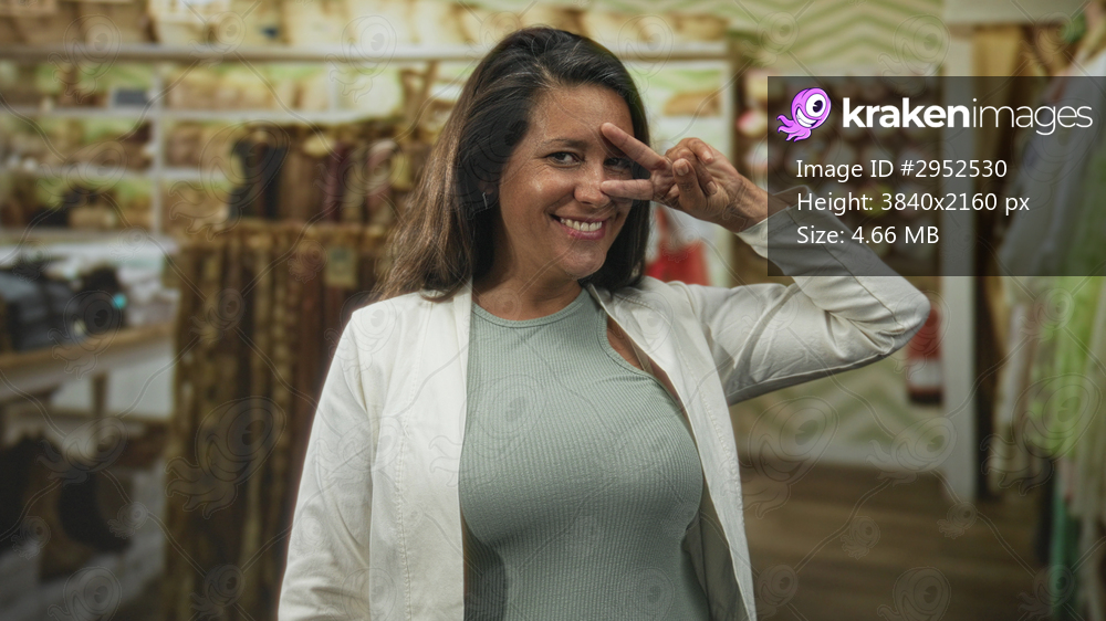 Woman showing peace sign with hand in a boutique building, smiling in a white jacket and mint green top among clothing racks; cheerful.