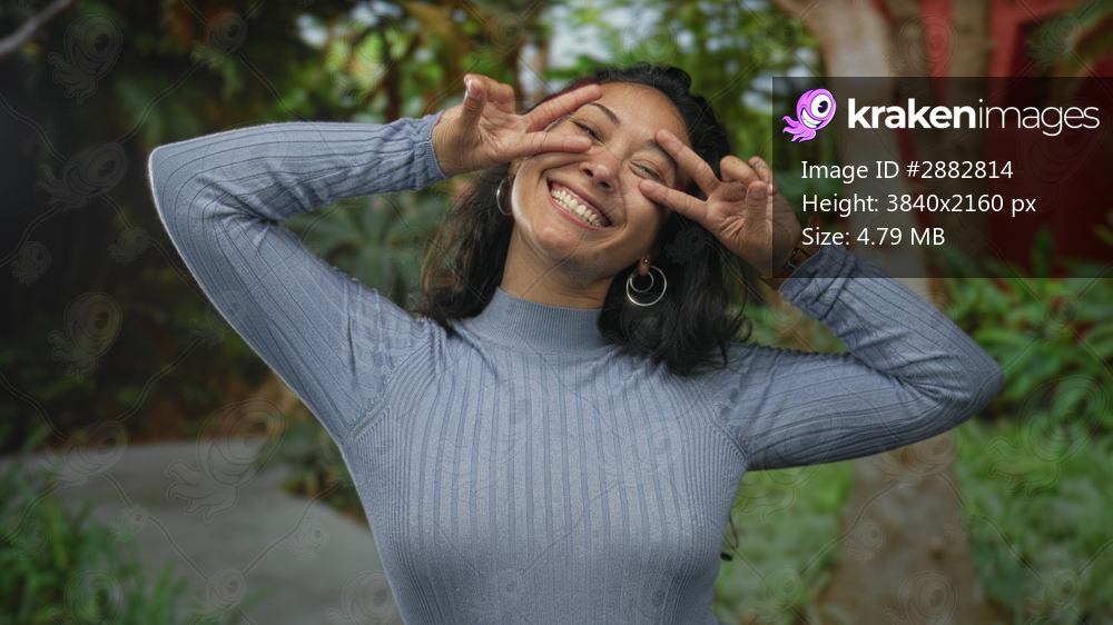 Woman showing peace sign with hand in forest park, smiling and facing camera, wearing blue sweater and hoop earrings; joy playfulness youth.