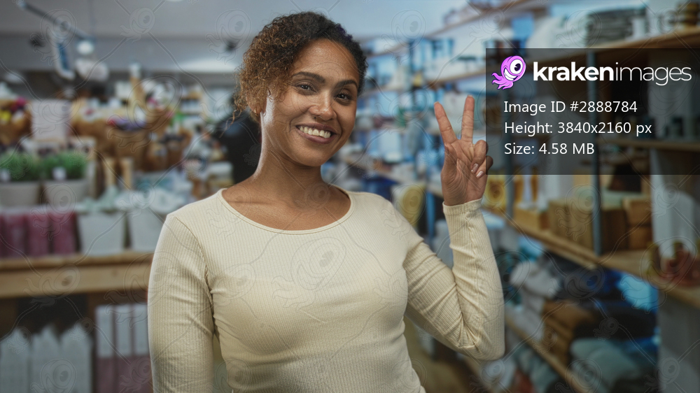 Woman showing peace sign with hand while browsing in a home decor shop aisle; joyful friendly moment.
