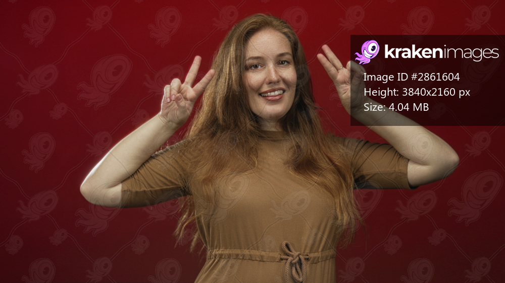 Woman showing peace sign with hands and smiling face in red studio wearing brown dress with long hair; playful.