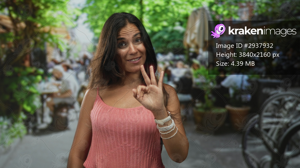 Woman showing peace sign and presenting open palm on street restaurant terrace wearing pink tank top and bracelets; playful greeting.