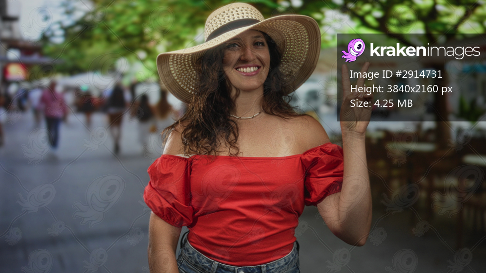Woman showing peace sign with raised hand on a street terrace restaurant wearing straw hat and red off shoulder top smiling; carefree vacation.