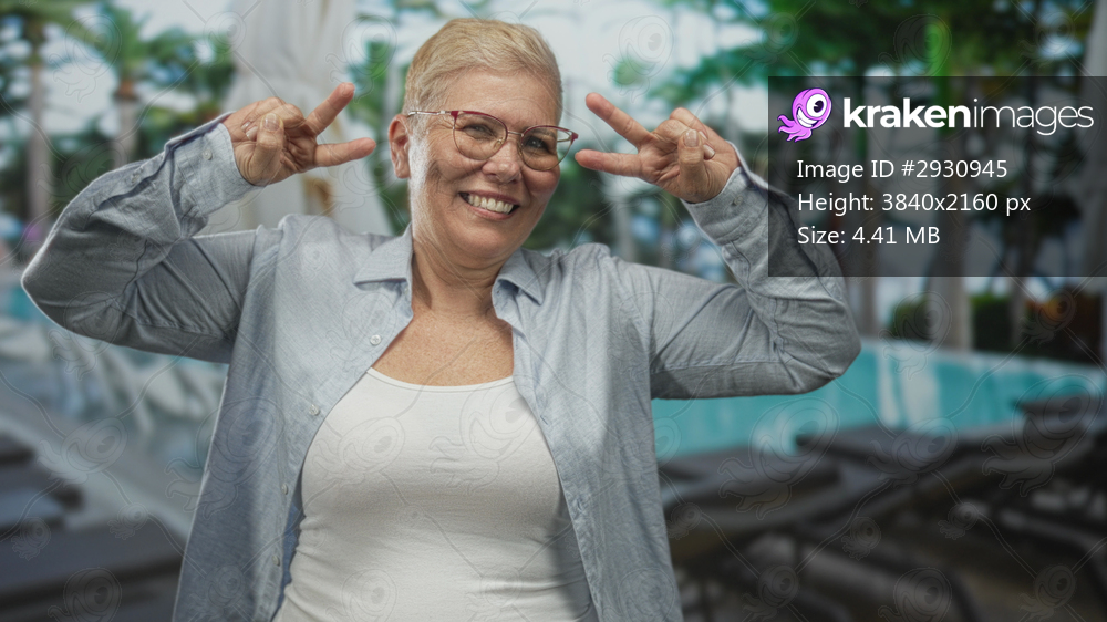 Woman showing peace signs with both hands at an outdoor pool by building with loungers and palm tree; joy vacation fun.