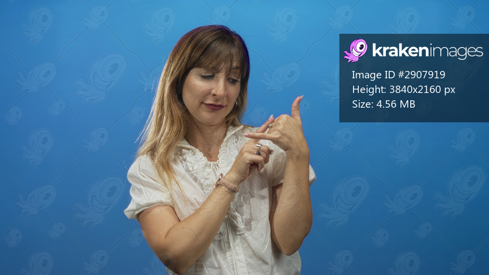 Woman showing phone gesture with right hand and pointing finger near ear in blue studio; contemplative listening personal reflection.