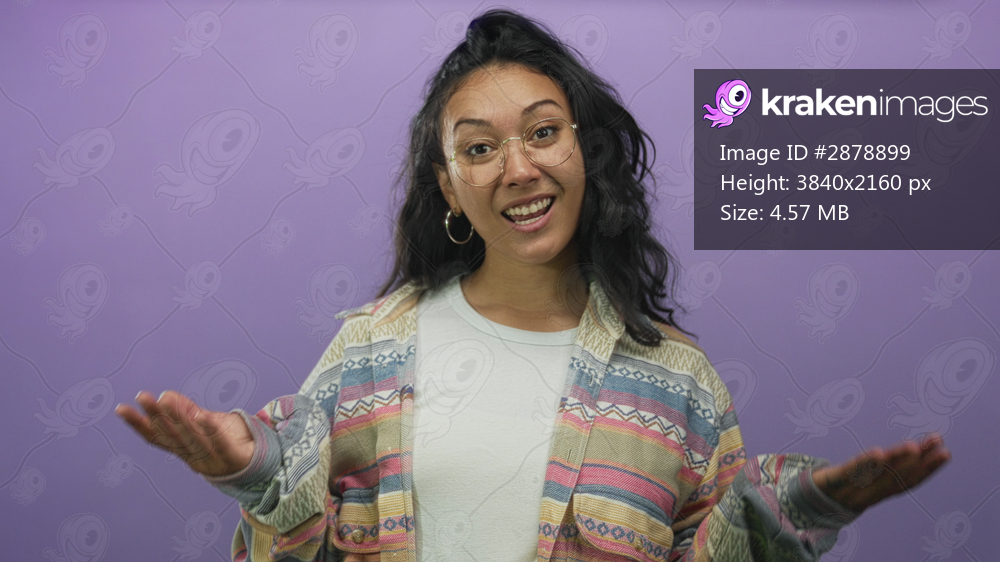 Woman showing raised hands and sticking tongue while wearing a patterned jacket in a purple studio; playful curiosity.